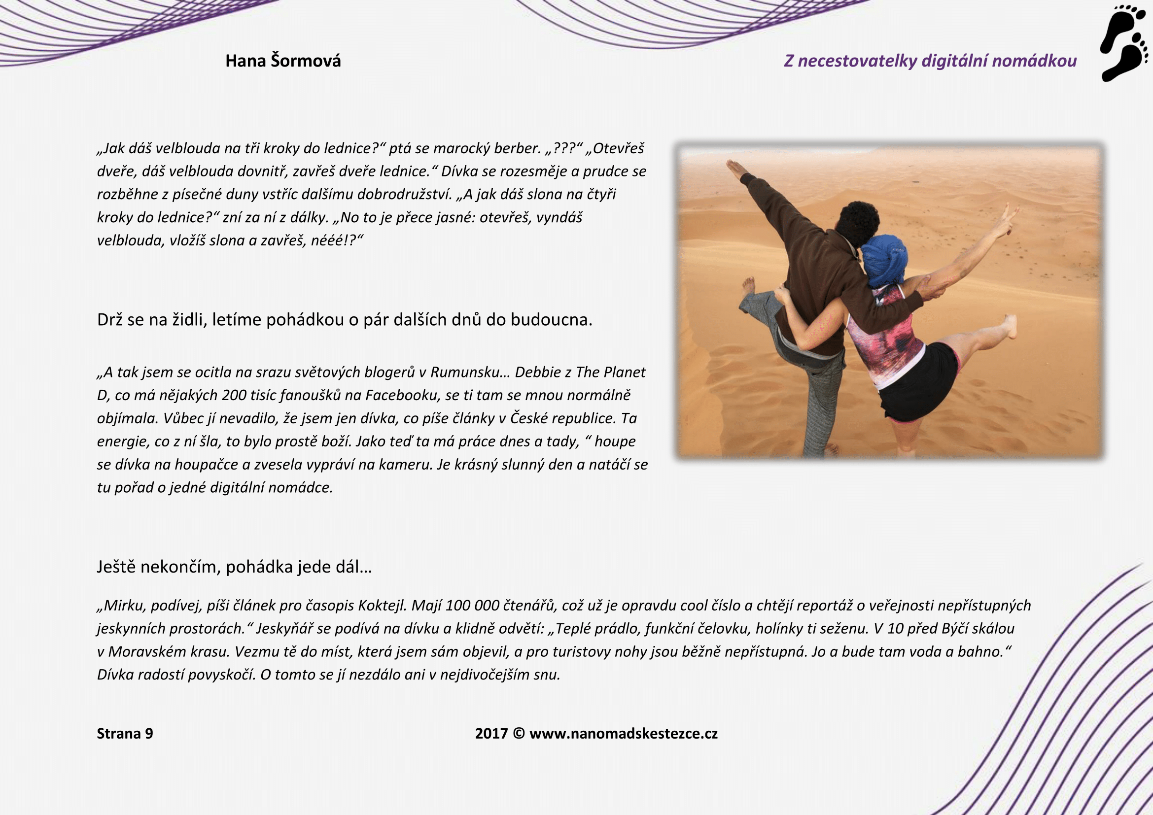 Autorkou e-booku je Hanka Šormová. Vášnivá cestovatelka, která právě díky touze po cestování spontánně opustila výhody práce v IT a vrhla se do tohoto životního stylu doslova pohlavě. Díky psaní vlastního blogu o cestování a psaní a copywritingu (psaní pro klienty) stihla během 3 let procestovat 17 zemí na 5 kontinentech (například Azory, Nový Zéland, Kuba, Izrael, Portugalsko, 2x Maroko, Lichtenštejnsko a další). Zažila tak velkou eufórii ze svobody a vyzkoušela si mnoho nového, například potápění se, jízdu na velbloudu, spaní v poušti, výstup na nejvyšší horu severní Afriky, návštěvy Hobitína. Právě tyto své zkušenosti vám předává nejen na starém blogu, ale i v tomto nabušeném e-Booku.
