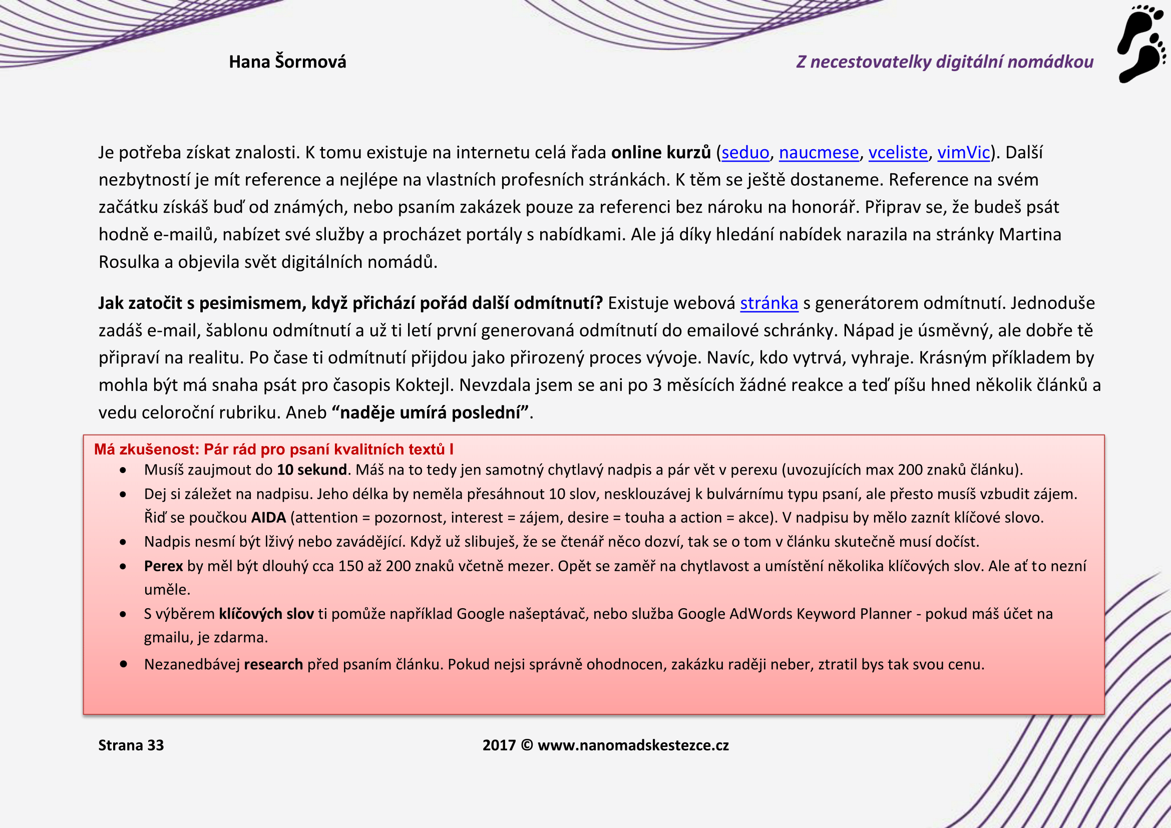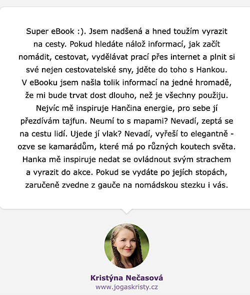 E-Book obsahuje 106 stran textu a jde rovnou k věci. Autorka nepíše omáčku, ale celý e-Book je prolinkovaný řadou odkazů na užitečné pracovní i cestovatelské nástroje. V bonusových kapitolách na konci vám prozradí: