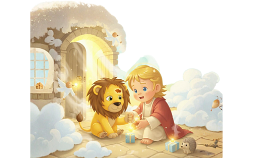 Ježíšek lvíčka provede svým královstvím, kde tak čtenáři nahlédnou do Sovince, Komnaty splněných přání, Velké balírny, ale i na Mlžné balkonky s výtahy na Zem či do stájí za pomocníčky.