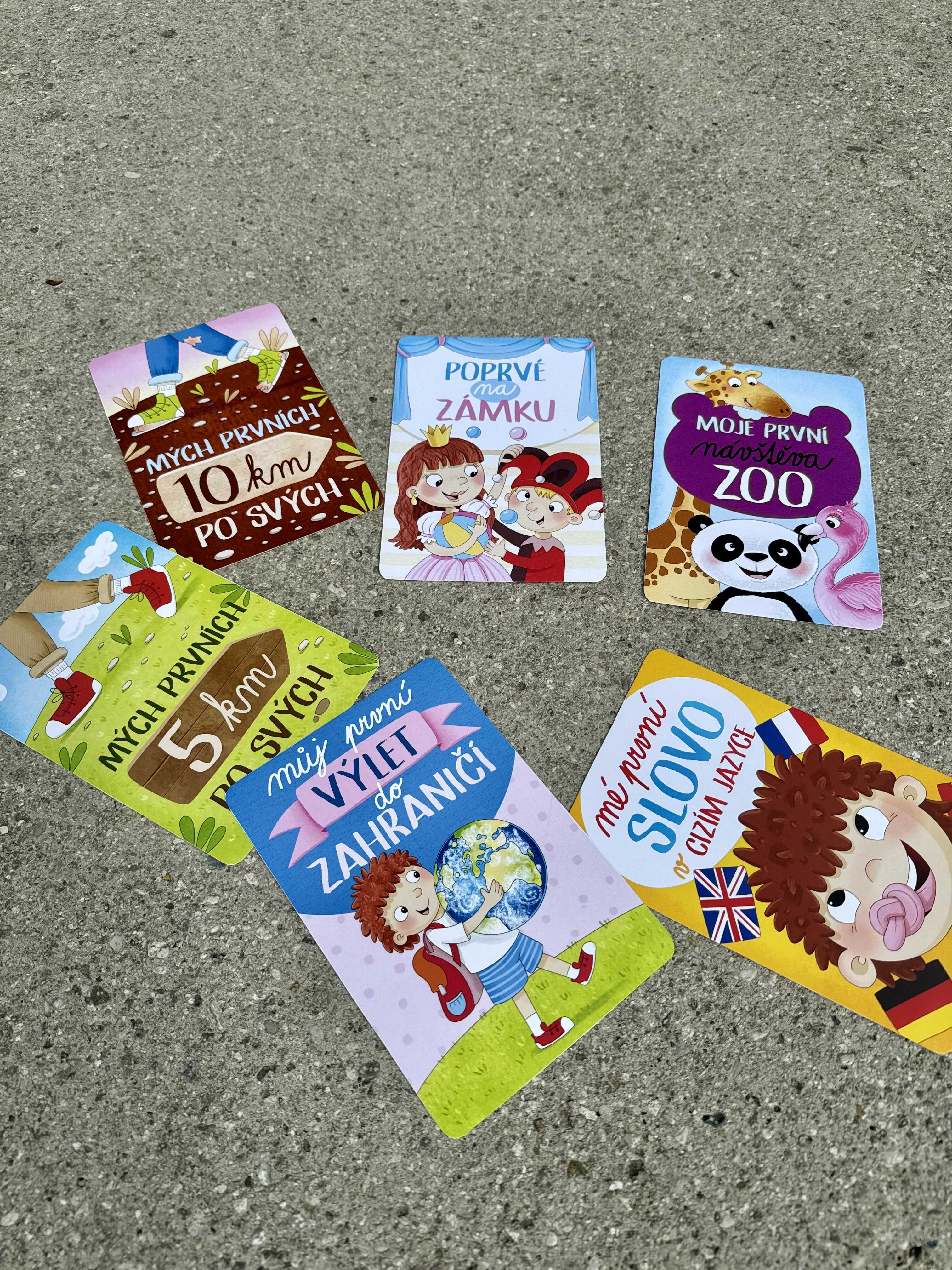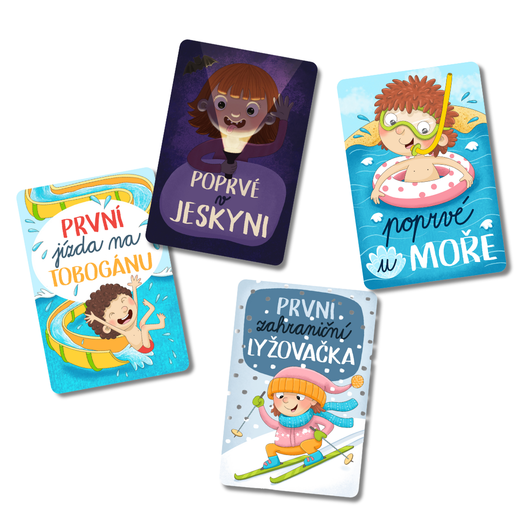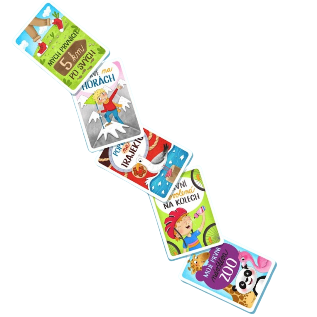 Jaké karty (významné dětské travel milníky) tam naleznete: Můj první výlet do zahraničí, Poprvé u moře, Poprvé na horách, Můj první let, Mých prvních 5 km po svých, Mých prvních 10 km po svých, Poprvé stanuji, Poprvé mimo Evropu, Poprvé jím mořské plody, Poprvé na trajektu, Mé první slovo v cizím jazyce, Poprvé v jeskyni, Poprvé na rozhledně, Poprvé na lanovce, První zahraniční lyžovačka, První dovolená na kolech, Poprvé na hradě, Poprvé na zámku, První jízda na tobogánu a Moje první návštěva ZOO.