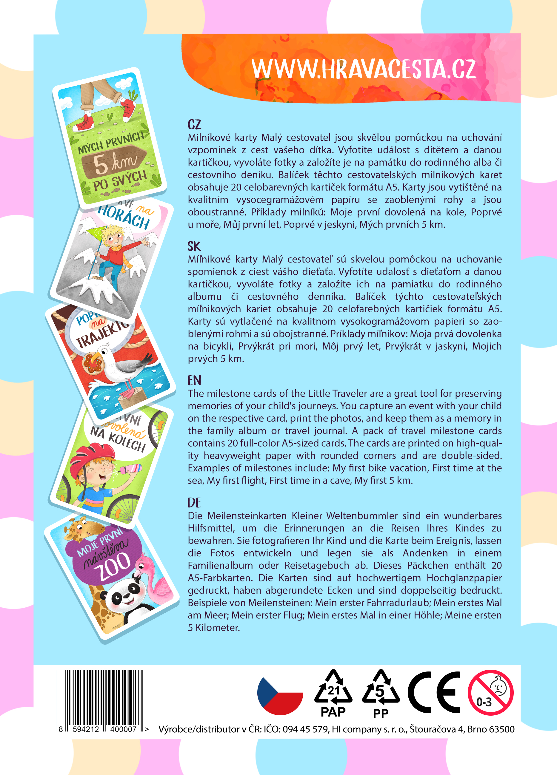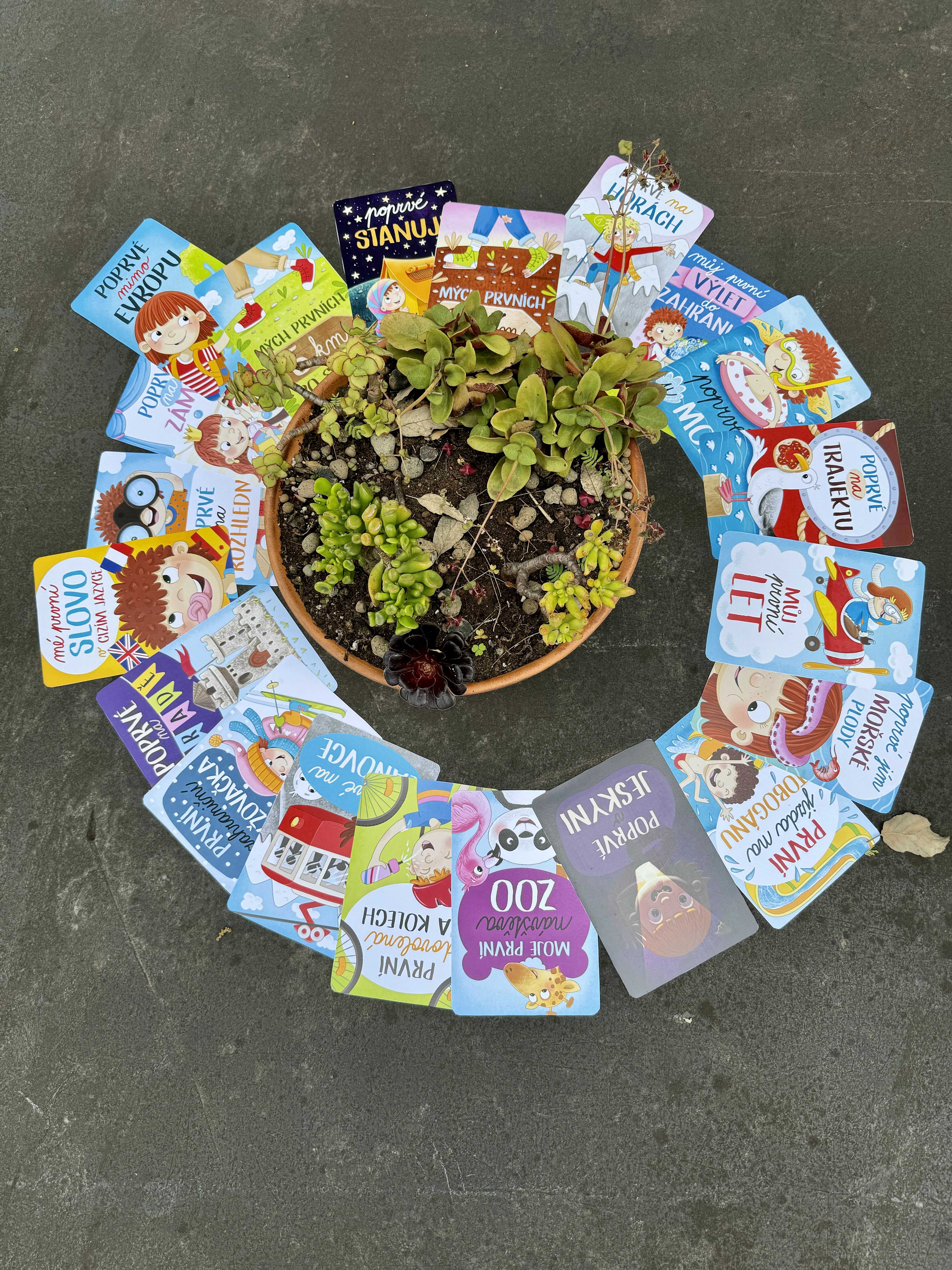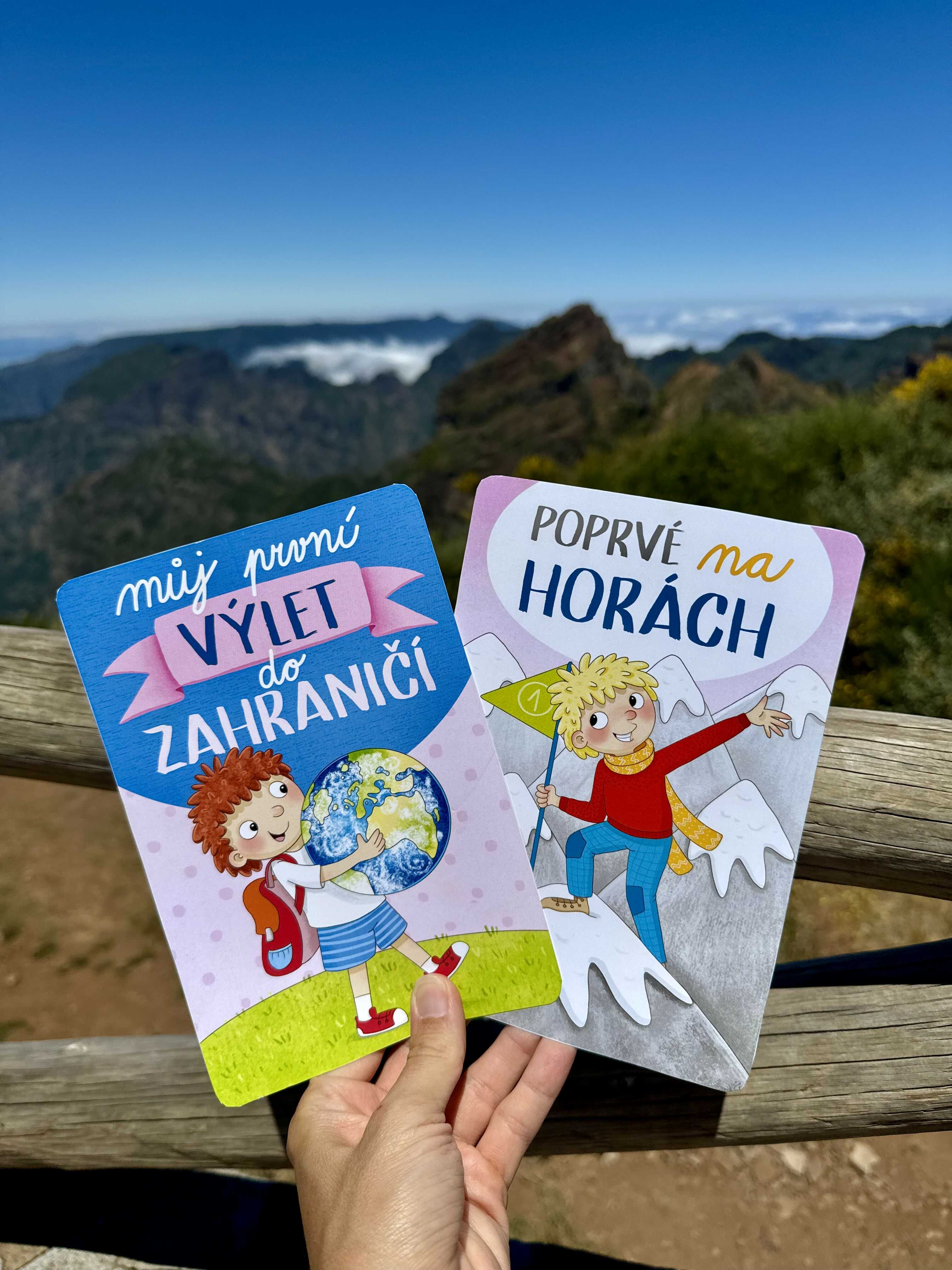 Jaké karty (významné dětské travel milníky) tam naleznete: Můj první výlet do zahraničí, Poprvé u moře, Poprvé na horách, Můj první let, Mých prvních 5 km po svých, Mých prvních 10 km po svých, Poprvé stanuji, Poprvé mimo Evropu, Poprvé jím mořské plody, Poprvé na trajektu, Mé první slovo v cizím jazyce, Poprvé v jeskyni, Poprvé na rozhledně, Poprvé na lanovce, První zahraniční lyžovačka, První dovolená na kolech, Poprvé na hradě, Poprvé na zámku, První jízda na tobogánu a Moje první návštěva ZOO.