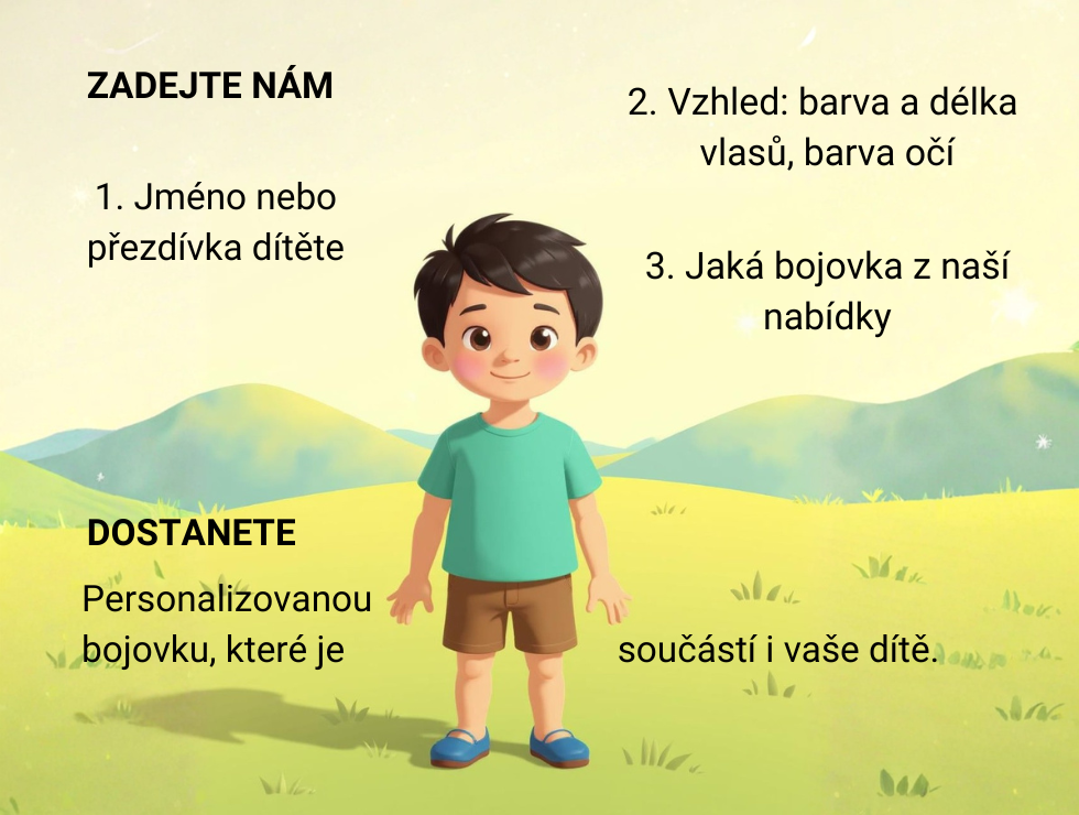 Upravíme jakoukoliv bojovku z naší nabídky (kategorie Bojovky), tak aby vedle hrdinů bojovky se objevil i váš kluk. A to jak na ilustracích jednotlivých stanovišť, tak v samotném textu příběhu. Výsledkem je personalizovaná bojovka podle vašeho přání. Od vás potřebujeme pouze znát jméno/přezdívku malého hrdiny a základní popis (barva a délka vlasů, případně i tvar (kudrnaté, rovné, culík/y) a barva očí, případně i brýle lze přidat).