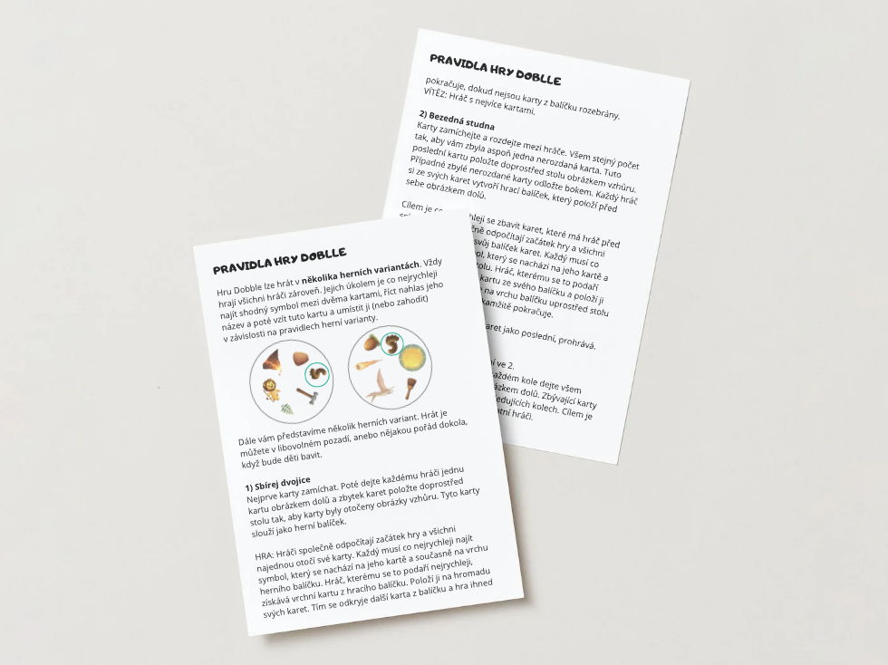 - 16 stran (vždy rub a líc), kde už jsou samotné herní karty s obrázky.